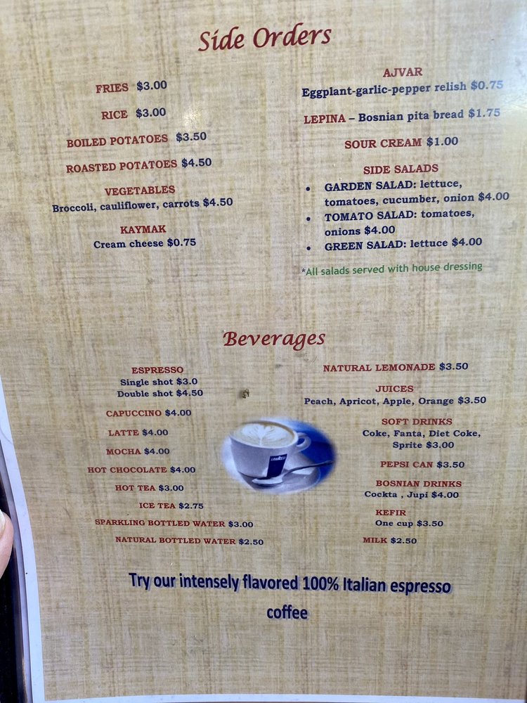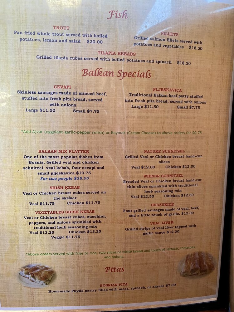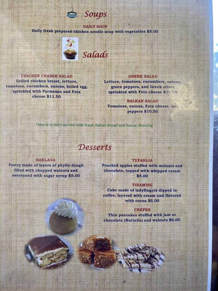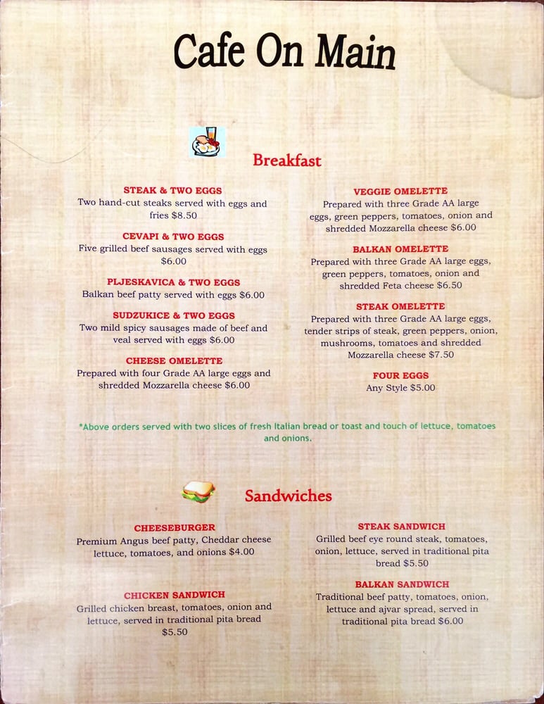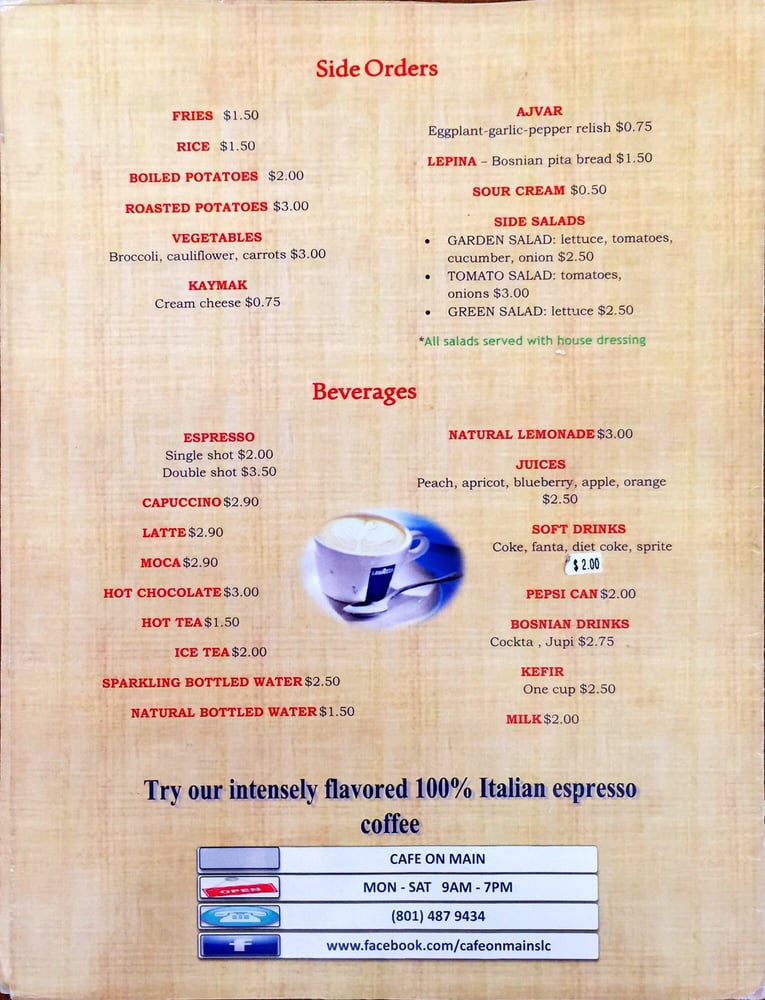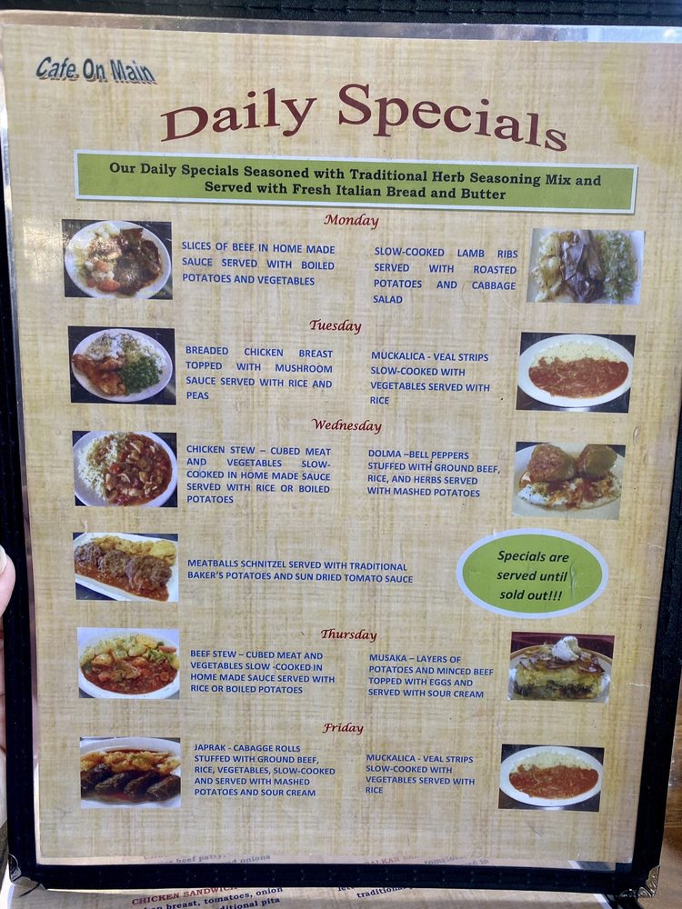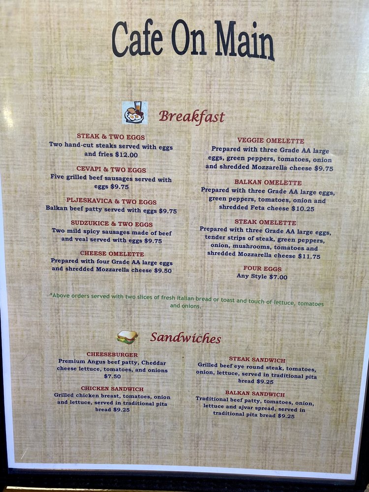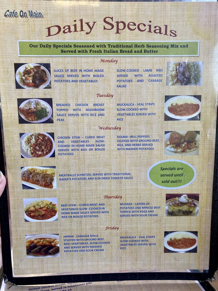 Cafe On Main is a delightful cafe located in Salt Lake City, offering a range of delicious dishes in a casual yet classy setting. The menu boasts a variety of breakfast options, including Balkan Omelette, Cevapi with eggs, and Cheese Omelette. For lunch, their Balkan Sandwich, Cheeseburger, and Chicken Sandwich are popular choices. If you're a seafood lover, don't miss out on their Grilled Salmon Fillets, Tilapia Kebabs, and Pan Fried Whole Trout. With amenities like outdoor seating, free Wi-Fi, and TV, Cafe On Main caters to all your dining preferences. Whether you're looking for a quick bite or a leisurely meal with friends and family, this cafe is the perfect spot to satisfy your cravings. Plan a visit or opt for their convenient delivery and takeout options to enjoy their delectable offerings.
